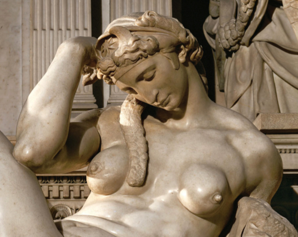 Assorta in un sonno ristoratore, se ne sta semi distesa sopra il sarcofago di Giuliano de’ Medici, duca di Nemours.