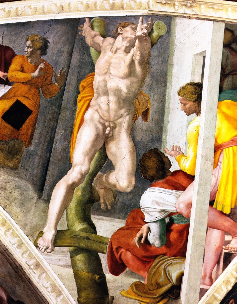 Una delle scene che preferisco di tutta la volta della Cappella Sistina è raffigurata in uno dei quattro pennacchi: la crocifissione di Aman. Ho pensato di raffigurare in un unico momento pittorico la sintesi della storia di Aman, il ministro del re persiano, e la moglie Ester.
