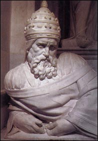 A venir notata meno è proprio la raffigurazione di Papa Giulio II, eppure ho lavorato giorno e notte a quell’opera affinché potesse suscitare qualche emozione. Gl’ho fatto assumere una doppia torsione e per rendere il suo dinamismo ancor più efficace, ho separato le due gambe scavando a fondo nel marmo di Carrara creando un’ombra intensa.