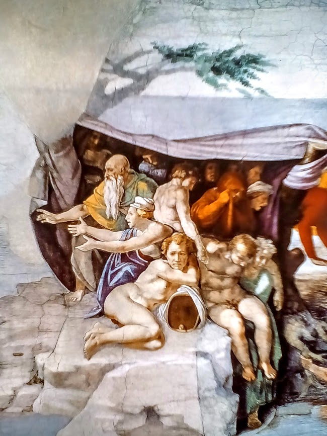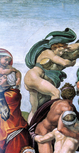 Il primo riquadro che affrescai della volta della Cappella Sistina è quello raffigurante il Diluvio Universale. Appena dopo averlo realizzato mi resi conto che le troppe figure viste dal basso confondevano solo le idee. Non è possibile leggere chiaramente a una distanza notevole la storia che lì vi narrai.