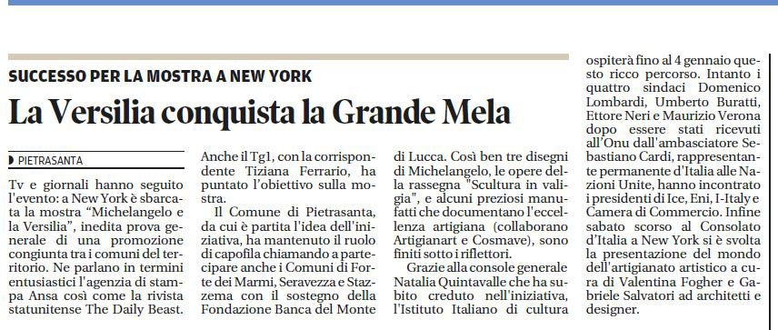 Fatto sta che da pochi giorni, ovvero il 4 dicembre 2014, è stata inaugurata l’esposizione “Michelangelo e la Versilia” presso l’istituto di cultura italiana a New York ubicato nella zona di Park Avenue.