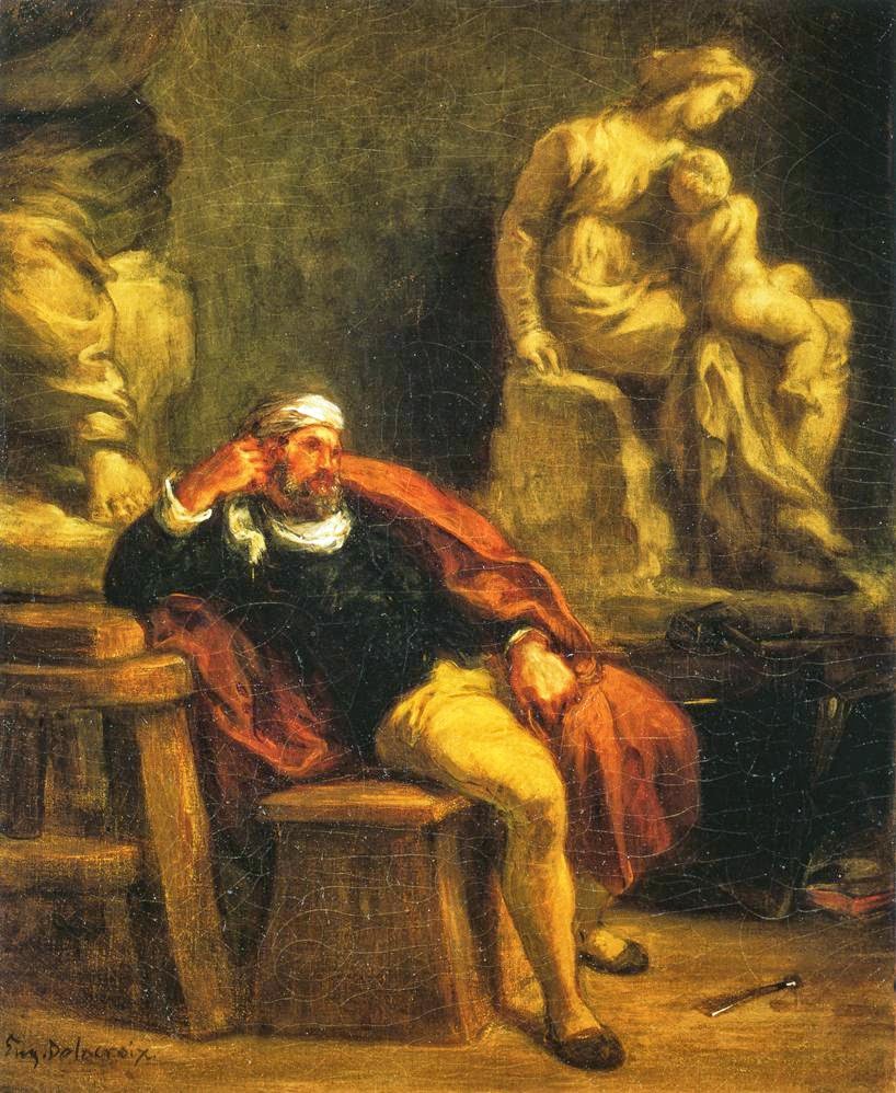 Il sempre vostro Michelangelo Buonarroti vi aspetta a Firenze per mostrarvi i fasti del passato. Vi lascio quest’opera di Eugene Delacroix, dove mi vedo ritratto mentre medito nel mio studio di via Mozza, a Firenze.