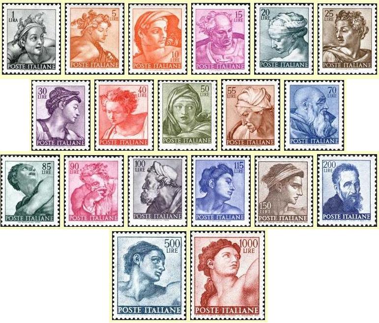 La serie cosiddetta michelangiolesca rappresenta l’unica emissione messa fuori corso nella storia della repubblica e riammessa l’anno successivo. Sono diciannove francobolli che partono dal valore minimo di una lira per uno degli ignudi finendo poi con la cifra record di 200 lire con il mio volto.. .quello ritratto da Daniele da Volterra.