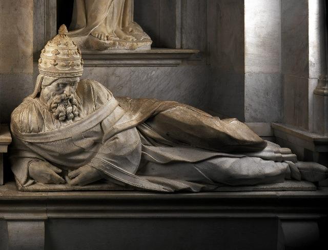 D’altro canto il Vasari nella sua prima edizione delle Vite scrisse “ è posato su’ risalti della cornice una cassa di marmo con la statua di papa Giulio II a diacere, fatta da Maso del Bosco scultore “. L’opera si trova sopra il Mosè che generalmente accentra tutta l’attenzione degli spettatori e viene guardata quasi come una decorazione in più, superflua.