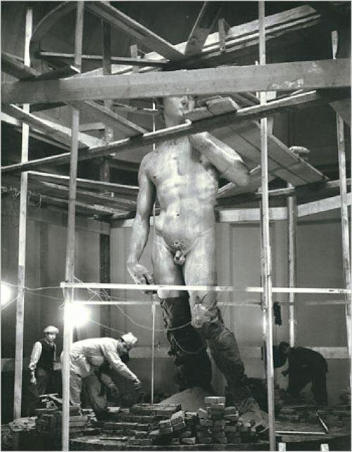 From autumn 1942, the timber and sandbags protections had to be replaced with special masonry roofing. The corridor of the Accademia Gallery leading to the David’s tribune took on a somewhat surreal appearance. The prisons, the Palestrina piety, the San Matteo and the David were encapsulated inside ogives made of bricks and cement.