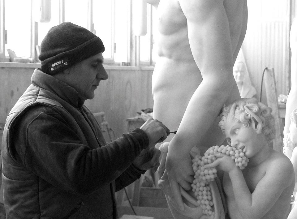 Stefano Lazzerini al lavoro sulla copia del mio Bacco presso il laboratorio di Massimo Galleni, Pietrasanta