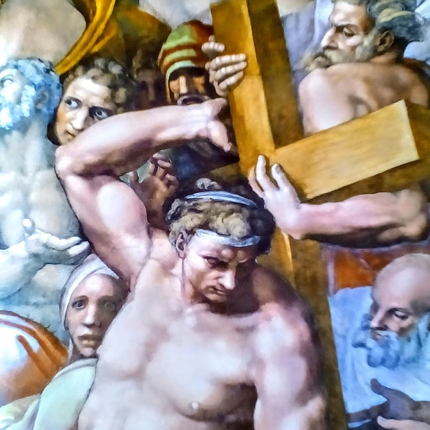 Nella porzione di affresco del Giudizio Universale a seguire, non vi sarà difficile riconoscere San Pietro con le due chiavi in mano del Paradiso. Il mondo terreno è terminato e la chiave d’oro e quella d’argento a nulla più servono. Mentre nel’affresco del Perugino presente nel secondo registro della Cappella Sistina è San Pietro che riceve le chiavi da Cristo, qui le riconsegna al legittimo proprietario.