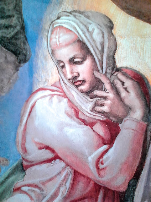 She is all huddled to the right of her Son, wrapped in a pink robe and with part of the blue cloak covering her legs. It is right under the raised arm of Christ that gives life to all the circular motion of the Last Judgment. Look at the face of the Madonna facing down: she has a compassionate look but also aware of the fact that now she can no longer do anything to save souls.