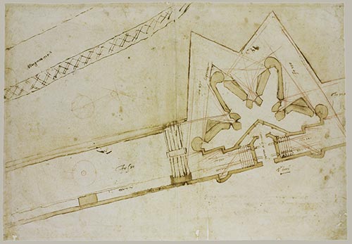 The papal troops, under the baton of the command challenged by Pope Leo X, wanted to regain possession of the city. I undertook to design a brand new wall tilting on each side to remove power from gunshots. Both detailed drawings and summary sketches have come down to me from this ingenuity of mine. The circle of walls I designed was rich in hollow and particularly resistant convex shapes.