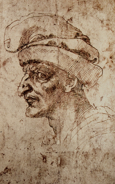 I tratti incrociati presenti nel disegno sono tipici della mia fase produttiva giovanile ed è possibile datarlo attorno al 1504-1505. E’ inoltre ipotizzabile pensare che la testa sia uno studio per un guerriero che doveva essere affrescato nella Battaglia di Cascina che alla fine però decisi di non inserire.