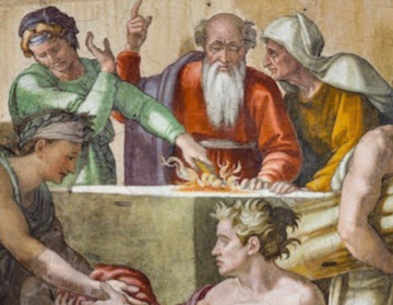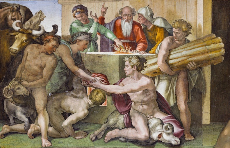 I decided to give life to this episode of Genesis in one of the five smaller panels of the Sistine vault. It is a very classical composition, with animals sacrificed in the foreground and five men who are engaged in different roles all around.