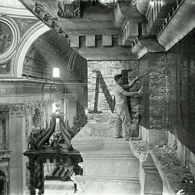 Nella foto precedente vedete un uomo al lavoro sulle scritte a mosaico nella navata centrale della Basilica, cominciate nel giugno del 1934 e terminate nel febbraio del 1935. 266 lettere in totale che hanno richiesto l’impiego di 16 quintali di tessere in smalto. Le sole lettere hanno un’altezza di 1,40 metri.