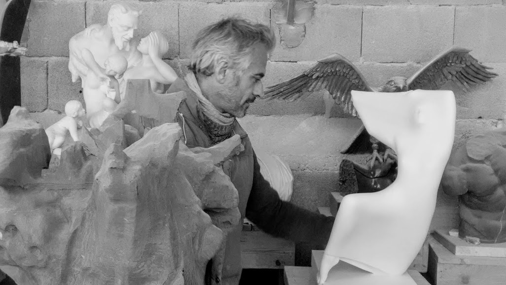 Nato nel 1966, ha origini franco-americane e a quindici anni già si dava da fare con martello e scalpello. Nella foto che vedete sopra è assieme a una sua interessante opera di cui vedete solo una porzione. Non posso mostrarvi di più e me ne rammarico ma per il momento dovete accontentarvi. Dato che dovrà essere esposta in una prossima mostra, è meglio che rimanga un po’ in disparte per non rovinare la sorpresa.
