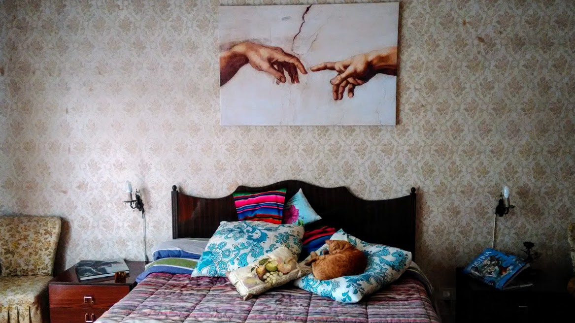 Lo sapete che son sempre stato malinconico e queste giornate buie non m’aiutano a pensare cose positive. L’altro giorno, mentre m’arroventavo la mente su questi pensieri, suonano alla porta. Già pensando fosse l’ennesima bolletta da pagare ho aperto e invece trovo sull’uscio un paccone. Apro col gatto che m’ha fatto da aiutante e scopro una grande riproduzione del brano di pittura che affrescai anni orsono: la mano del Padreterno che si protende verso quella di Adamo.