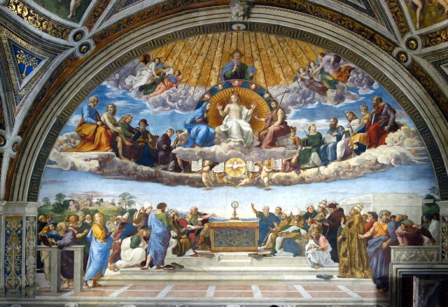 The Stanza della Segnatura is the best known. Here, where the pontiff’s library was located, Raphael wanted to portray the four arts of knowledge: The School of Athens which represents Philosophy, Dispute on the Sacrament, Theology, Parnassus, Poetry and Virtue, and Law symbolizing Law.
