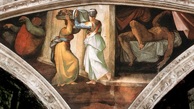 In the four angular pendentives of the Sistine Chapel, I frescoed the stories of the miraculous salvations of Israel: the Punishment of Aman, the Serpent of Bronze, David against Goliath and Judith with Holofernes. Here, today I want to talk to you about this last scene just mentioned.