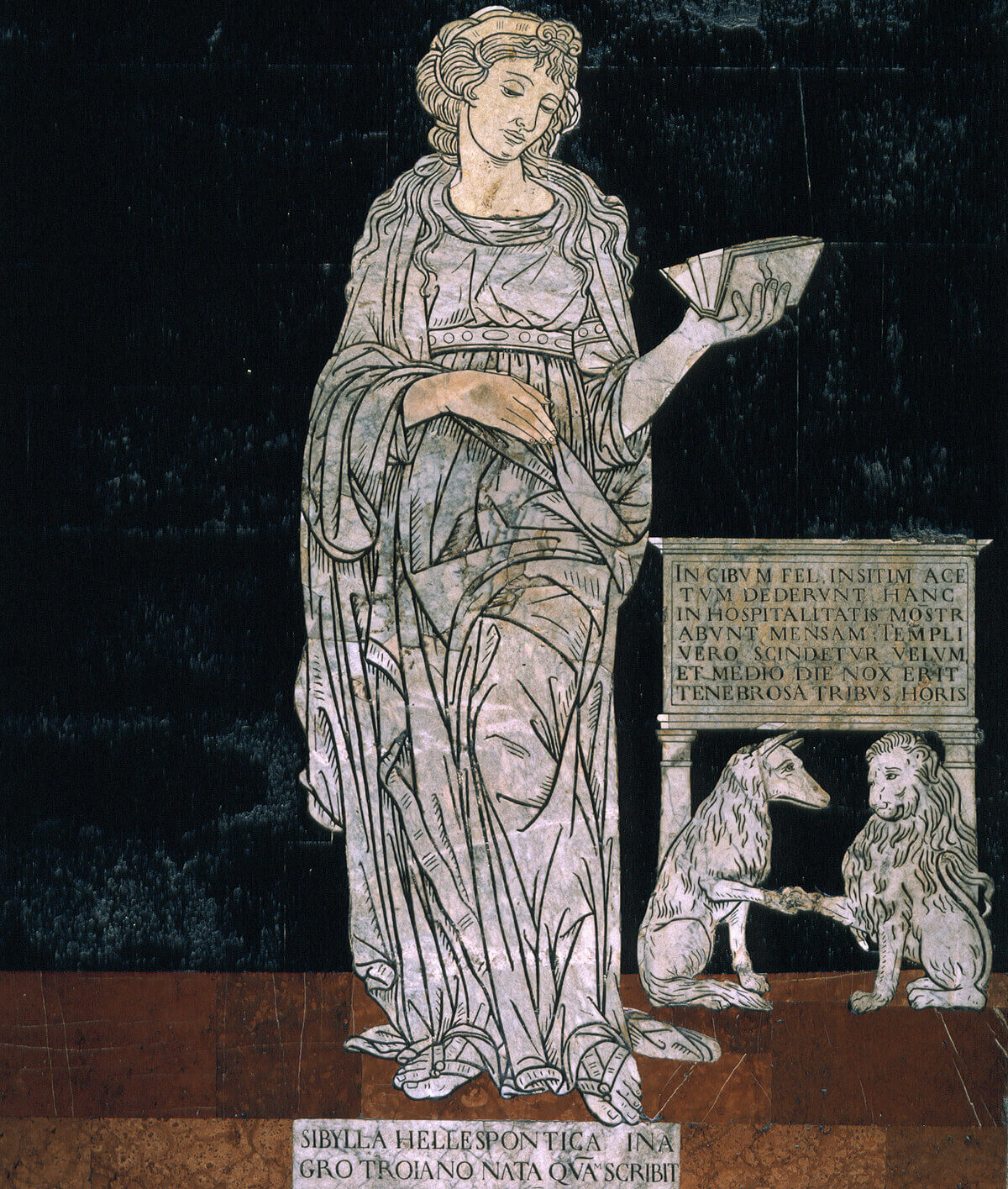 Entrando dalla navata centrale, si nota subito l’iscrizione che invita l’avventore a mantenere un comportamento rispettoso del luogo: CASTISSIMUM VIRGINIS TEMPLUM CASTE MEMENTO INGREDI ovvero “ricordati di entrare castamente nel castissimo tempio della Vergine. A seguire compare Ermete Trismegisto, fondatore della sapienza umana e nelle navate laterali le Sibille: è il percorso iconografico ispirato dall’opera di Lattanzio Divinae Isntitutiones, del IV secolo d.C.