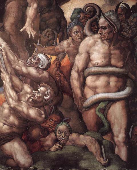 Perché gli affibbiai proprio le sembianze di Biagio da Cesena? I motivi sono due: si era lamentato con papa Paolo III dei troppi nudi del Giudizio prima ancora che lo terminassi ma soprattutto era un sodomita violento con una storia alle spalle da brividi. Ecco perché per lui non avrei potuto scegliere posto migliore di quello per stare.