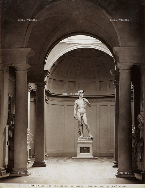 Nell’immagine successiva appartenente agli Archivi Alinari vedete il David già sistemato nella tribuna progettata da de Fabris con ancora la foglia di fico a coprire i genitali. Anno 1890.