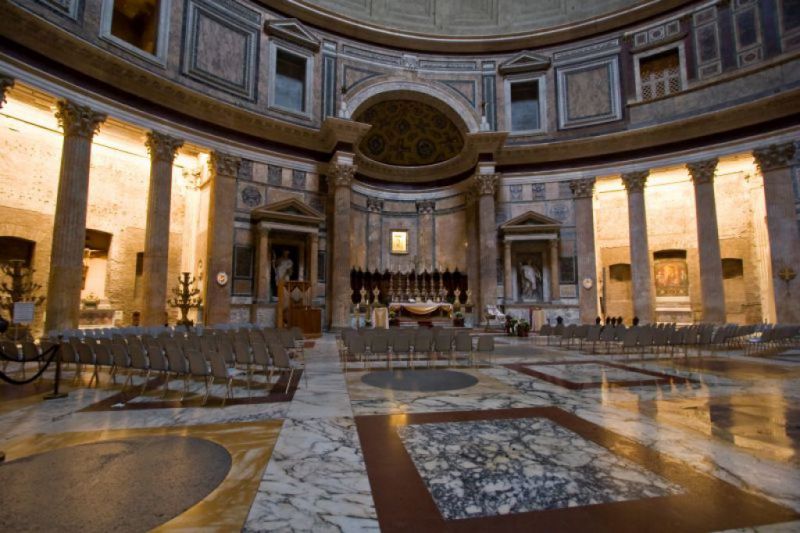 All’interno del Pantheon ci sono sette nicchioni preceduti da coppie di colonne realizzate in pavonazzetto e giallo antico. Per quanto possa stupirvi, il pavimento è gran parte ancora quello originale con i suoi preziosi marmi che disegnano motivi quadrati e cerchi.