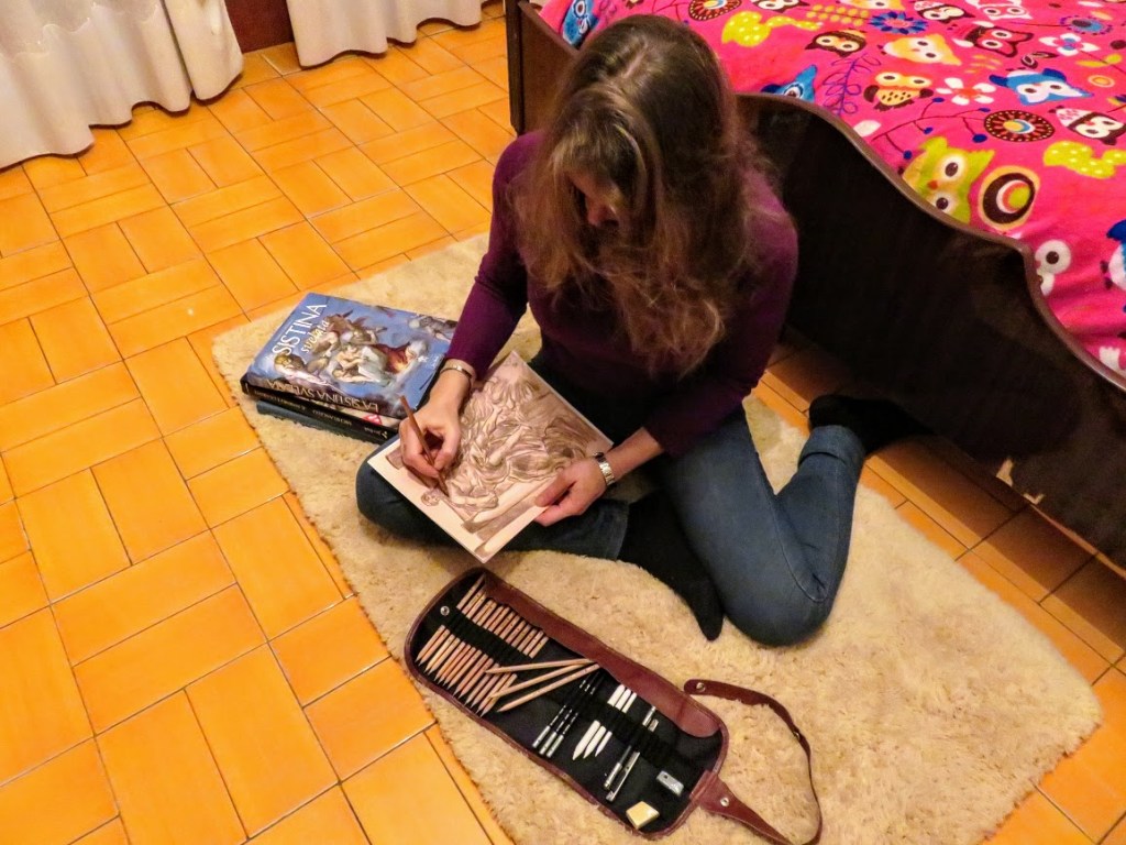 ° L’astuccio arrotolabile con 18 pezzi fra matite a diversa durezza, gomme, carboncini e trincetto è per il mio amato Tommaso de’ Cavalieri. Gli garba disegnare ed è pure bravo così si esercita perbene.