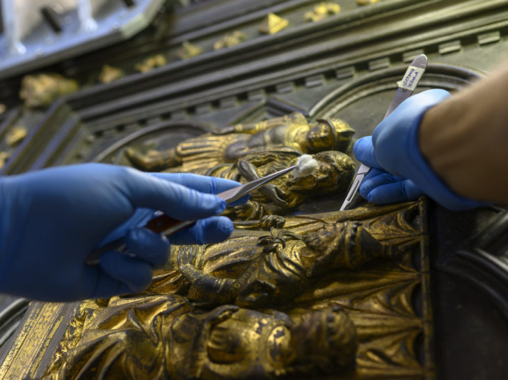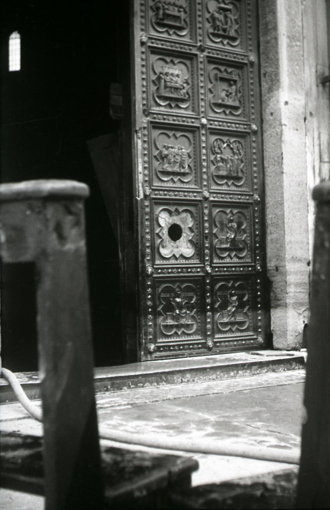 L’alluvione del 1966 danneggiò in modo importante tutte e tre le porte. Furono ripulite dal fango e riattaccate le parti distaccate delle formelle ma poco a poco non solo le dorature si opacizzarono ma fu evidente che c’era la necessità di effettuare un intervento di restauro importante.
