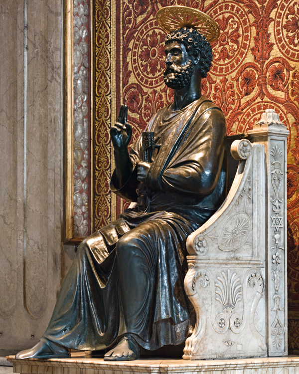 The bronze sculpture represents St. Peter in the chair in the act of blessing in the Greek manner with his right hand extended forward and the two fingers raised. In his left hand he holds the keys of the kingdom of heaven.