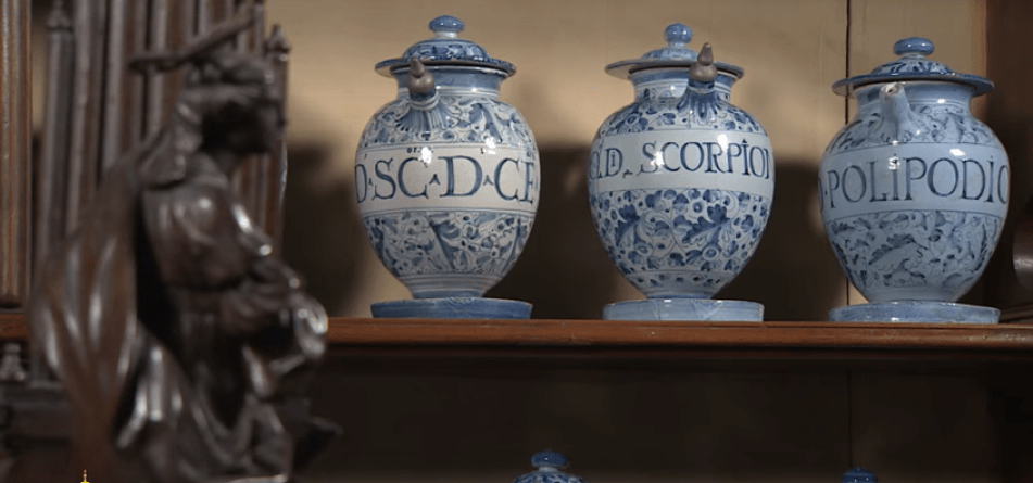 In una di queste sale c’è l’intera farmacia del un monastero benedettino Santa Cecilia in Trastevere che pio XI acquistò 1937 dalle suore benedettine con pezzi originali del Seicento.