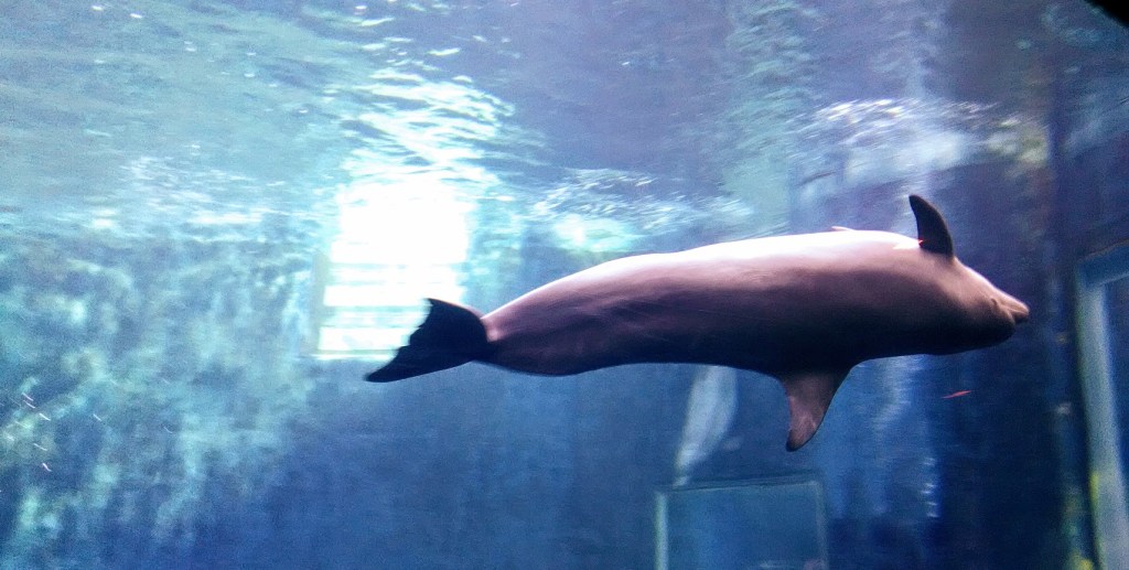 Il padiglione dei cetacei è visibile da differenti prospettive. La vista più spettacolare forse è quella del tunnel subacqueo lungo 15 metri che consente di vedere i delfini nuotare, rincorrersi fra di loro e osservarli mentre si divertono a permanere davanti ai bocchettoni dai quali presumo arrivi acqua pulita. C’era un delfino in particolare che non si staccava da lì: pareva gradire in modo particolare il solletico provocato dai getti.