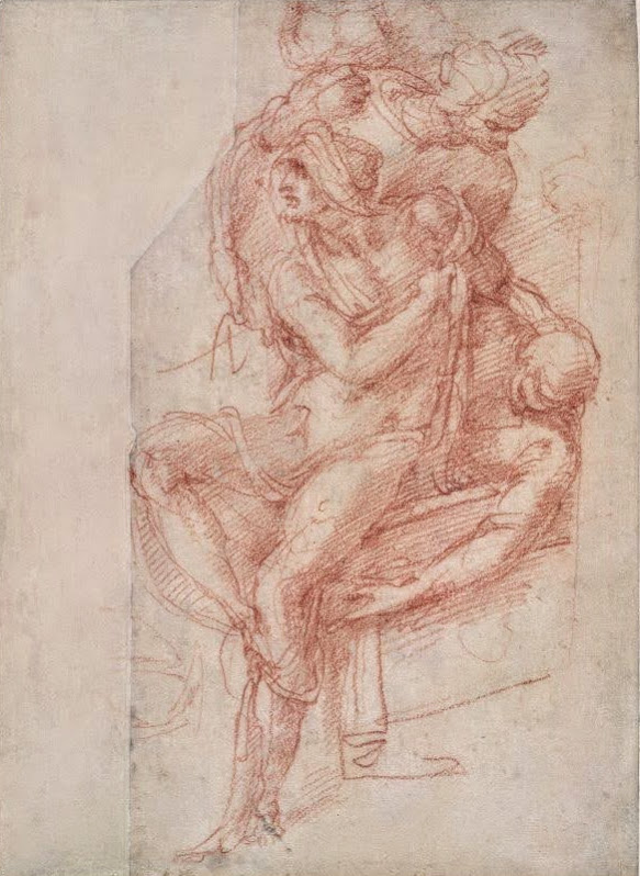 Siede su un lato del sarcofago dal quale è uscito e piega il braccio destro sul petto. Probabilmente è uno dei disegni che tracciai per studiare la composizione della pala d’altare dipinta poi da Sebastiano del Piombo.