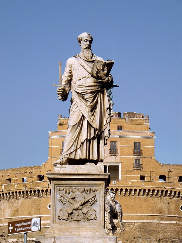 All’inizio del ponte, dalla parte opposta di Castel Sant’Angelo, accolgono pellegrini e turisti le sculture di San Pietro e San Paolo. San Pietro con le Chiavi del Regno dei Cieli fu scolpita da Lorenzetto nel 1534 mentre San Paolo che viene raffigurato con la spada è opera di Paolo Romano e fu realizzata diversi anni prima, nel 1464.