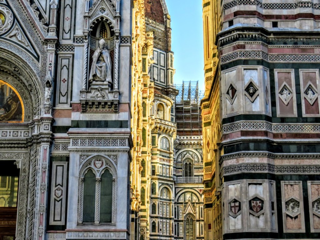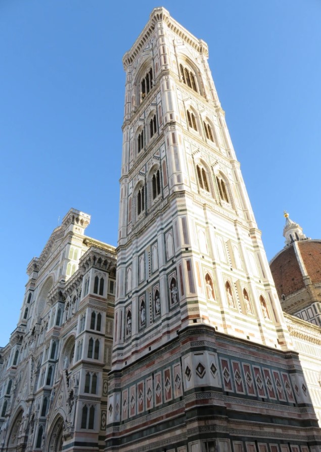 Giotto’s bell tower was covered with precious white marble from the quarries of Campiglia Marittima and Seravezza, serpentine green from Prato and red marble from Siena and Stazzema.