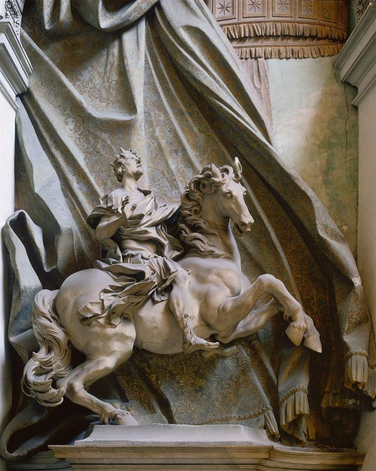 Constantine on horseback is stopped in the stone as in an instant photo when he had the vision of the cross, before the battle of Ponte Milvio. Bernini’s sculpture was balanced by placing the equestrian one of Charlemagne by Cornacchini on the other side of the atrium, completed in 1725.