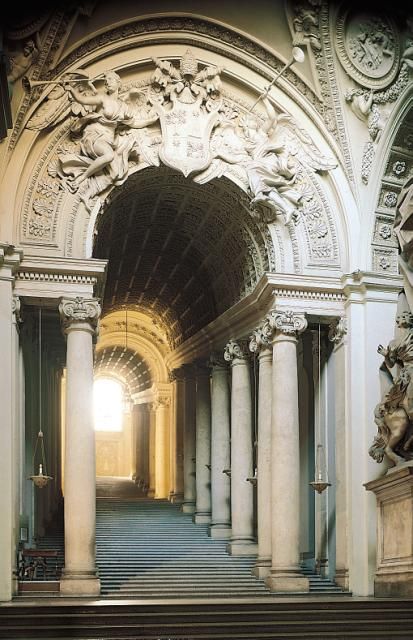 The beginning of the ramp is decorated at the top with the coat of arms of Pope Alexander VII between two angels while at the base, on the right of the viewer, there is the large equestrian statue of Constantine, sculpted by Bernini in 1670.