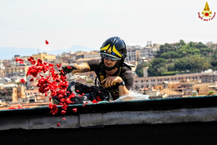 Al termine delle celebrazioni liturgiche della Pentecoste, i partecipanti vengono letteralmente avvolti da una cascata di petali di rose rosse che scende dall’alto grazie al lavoro dei Vigili del Fuoco che si arrampicano fino alla parte più alta della cupola trasportando sacchi stracolmi di rose già pronte all’uso.