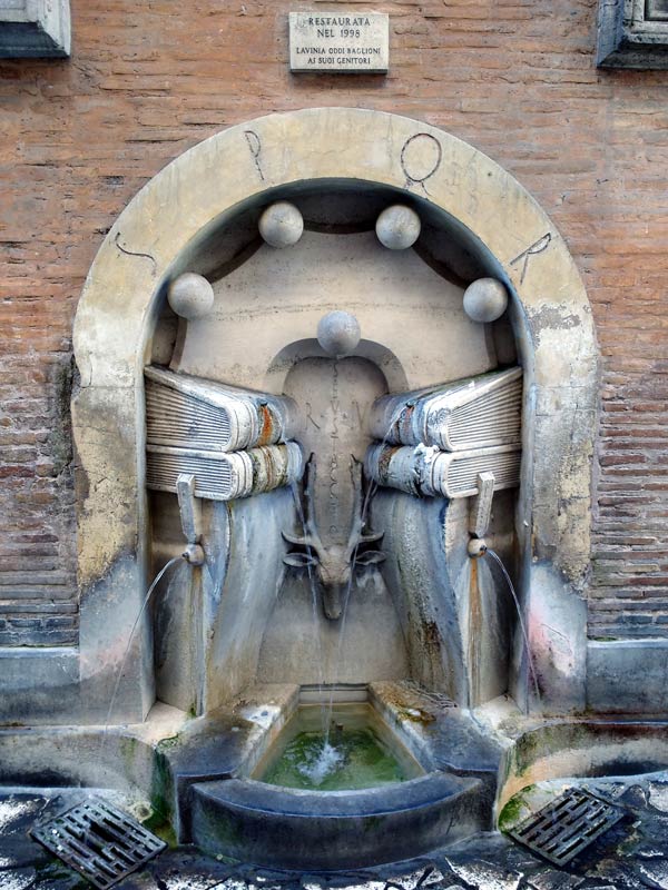 The fountain, set in a niche, is characterized by the presence of four voluminous ancient books. two places on the right and two on the left. In the center appears the head of a deer. What does this animal have to do with it? Well, it is nothing more than the symbol of the Sant’Eustachio district.