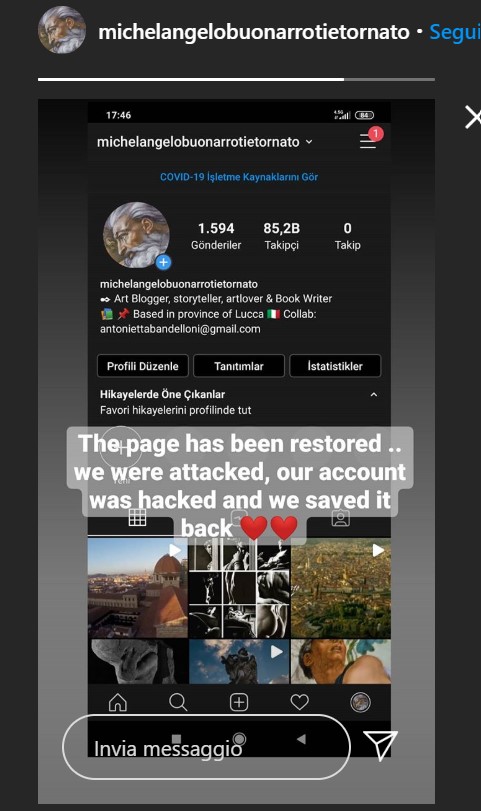 ENG Service update: the account Instagram that was stolen from me @michelangelobuonarrotietornato is not in my hands as they wrote in the stories. Do you see the Turkish text at the top of the screenshot? How could they be mine?