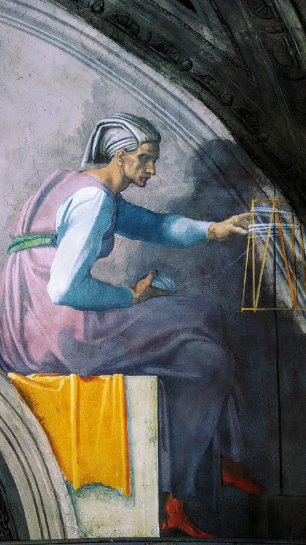 La Filatrice è una delle figure che affrescai nelle lunette con le storie degli antenati di Cristo. La potete vedere nella lunetta con Iesse, David e Salomon. L’uomo che si trova alle sue spalle, abbigliato alla maniera araba è David mentre lei è Betsabea, oramai anziana e abbandonata dal marito.