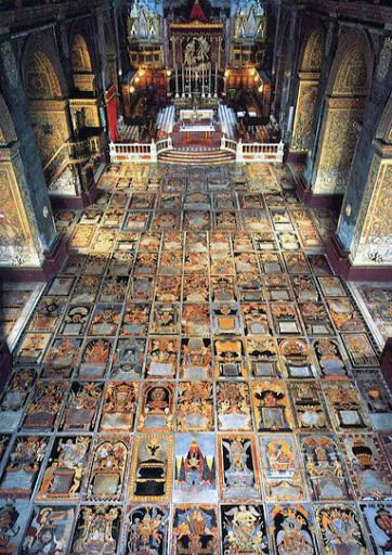 The floor is made up of about 400 tombstones of the Knights of Malta placed side by side. They are decorated with inlays of polychrome marbles from different areas. Each depicts different things. Some reproduce episodes from the life of the deceased while others epitaphs or allegorical representations all to be interpreted.