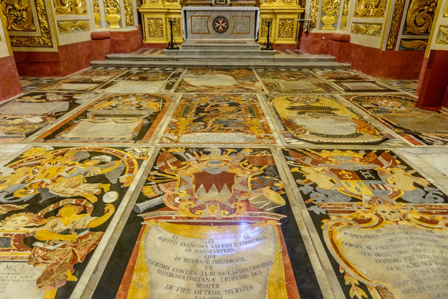 Il pavimento è formato da circa 400 lapidi di tombe dei Cavalieri di Malta affiancate le une alle altre. Sono decorate con intarsi di marmi policromi provenienti da zone diverse. Ciascuna raffigura cose diverse. Alcune ripropongono episodi della vita del defunto mentre altre epitaffi oppure raffigurazioni allegoriche tutte da interpretare.