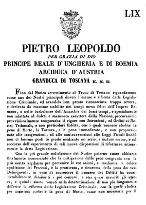 “Abbiamo veduto con orrore con quanta facilità nella passata Legislazione era decretata la pena di Morte per Delitti anche non gravi, ed avendo considerato che l’oggetto della Pena deve essere la soddisfazione al privato, ed al pubblico danno, la correzione del Reo figlio anche esso della Società e dello Stato, della di cui emenda non può mai disperarsi, la sicurezza nei Rei dei più gravi ed atroci Delitti che non restino in libertà di commetterne altri, e finalmente il Pubblico esempio; che il Governo nella punizione dei Delitti, e nel servire agli oggetti ai quali questa unicamente è diretta, è tenuto sempre a valersi dei mezzi più efficaci col minor male possibile al Reo …avendo altresì considerato, che una ben diversa Legislazione potesse più convenire alla maggior dolcezza, e docilità di costumi del presente secolo, e specialmente nel popolo Toscano, Siamo venuti nella determinazione di abolire come Abbiamo abolito con la presente Legge per sempre la Pena di Morte contro qualunque Reo”.