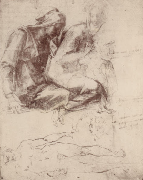 Per quel che mi riguarda non raffigurai Sant’Anna gravida ma preferii affiancare le due donne già adulte in qualche schizzo come quello che vedete nella foto sopra che si trova al Museo del Louvre.