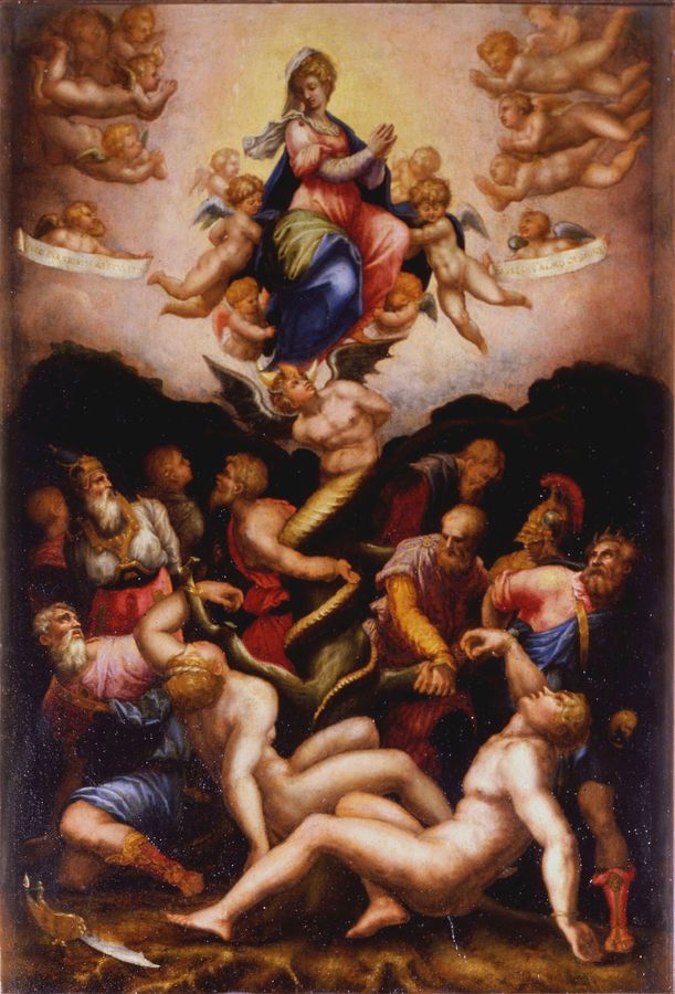 In the end, Vasari rotated the scene around the Tree of Good and Evil which is wrapped up in the coils of a snake that represents a demon with bat-like wings and a horned head. The Virgin in Glory tramples him with one foot while the cherubs fly all around her showing her scroll with the inscription “O gloriosa Domina”.