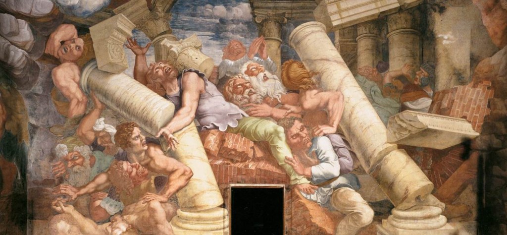 Come scrisse il Vasari “Non si pensi alcuno di vedere mai opera di pennello più orribile e spaventosa, né più naturale di questa. E chi entra in quella stanza, non può non temere che ogni cosa non gli rovini addosso…erano i Giganti grandi di statura, che da’ lampi de’ fólgori percossi ruinavano a terra… “.