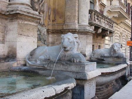Il resto del travertino utilizzato arrivava direttamente dalle Terme di Diocleziano mentre i due leoni di porfido e i due di marmo con tanto di iscrizione del faraone Nectabo I erano originali. Erano stati rinvenuti tempo prima al Pantheon durante gli scavi effettuati il pontificato di Eugenio IV. Nella prima metà dell’Ottocento furono sostituiti con copie realizzate dal Tadolini e gli originali messi al riparo da eventuali danneggiamenti nei Musei Vaticani.