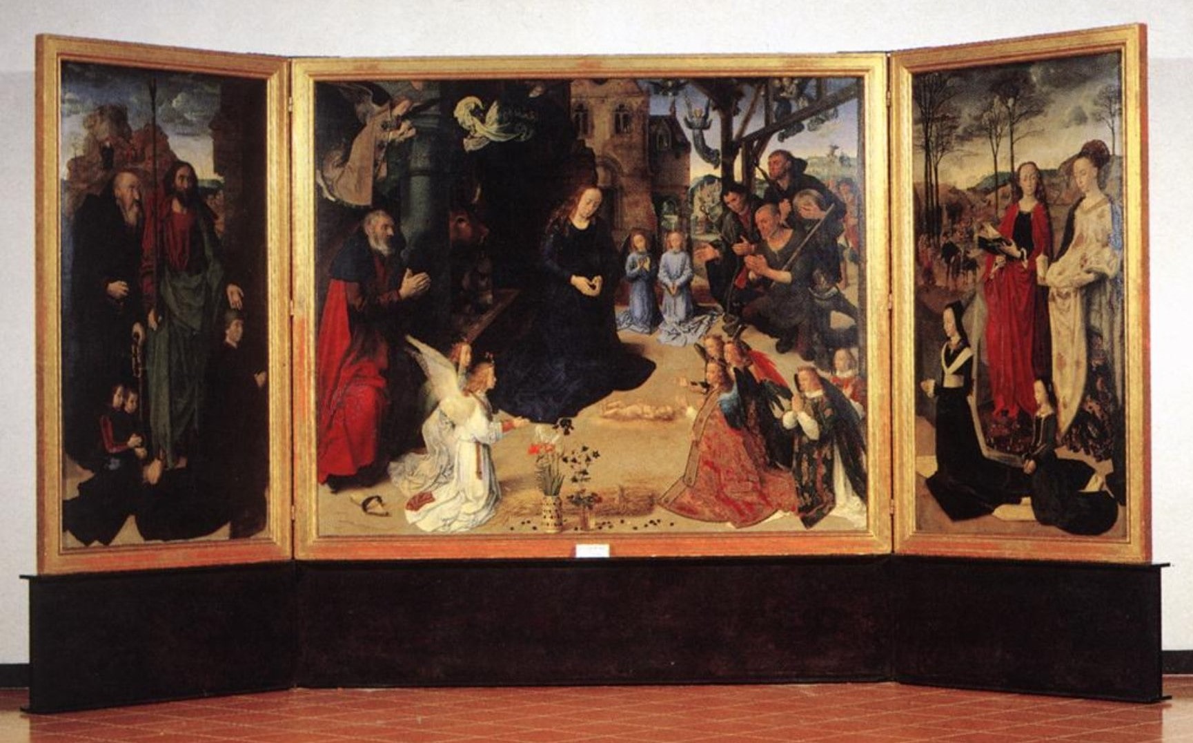 Nella tavola centrale viene raffigurata l’Adorazione dei Pastori mentre in quelle laterali sono presenti i committenti in compagnia dei propri Santi Protettori. Van der Goes curò ogni particolare in modo dettagliato caratterizzando ogni personaggio con espressioni differenti, rughe, sorrisi o espressioni stupite.