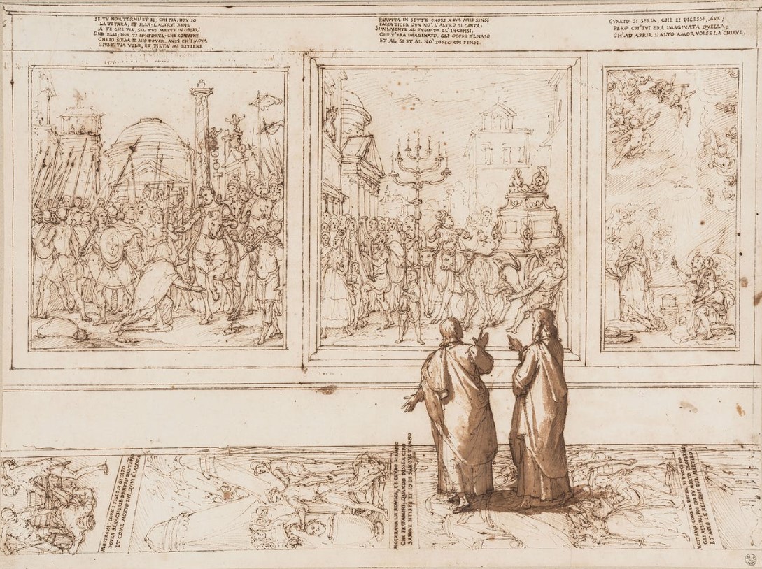 Il percorso espositivo è suddiviso in tre tappe, una per ogni parte della Divina Commedia: Inferno, Purgatorio e Paradiso. Zuccari realizzò gli 88 disegni durante il suo soggiorno spagnolo e la collezione apparteneva all’Elettrice Palatina. Entrò a far parte del nucleo di disegni degli Uffizi nel 1738, grazie proprio alla donazione fatta dalla stessa Elettrice Anna Maria Luisa de’ Medici.