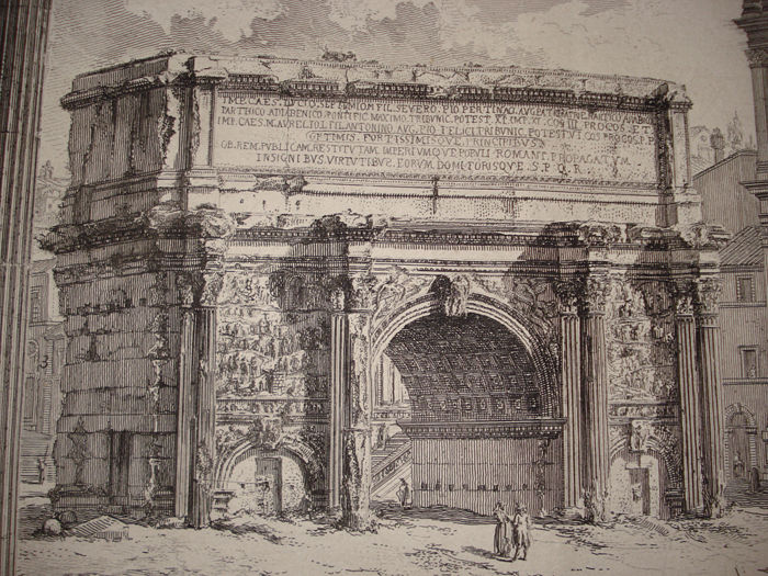 Piranesi realizzò una bellissima acquaforte dedicata all’Arco di Settimio Severo ed è quella che vi propongo a seguire.