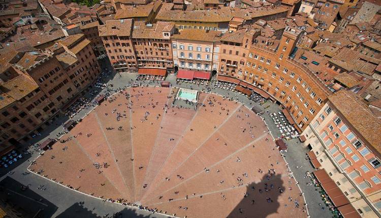 Per arrivare a vedere la meravigliosa Piazza del Campo dall’alto, con la sua singolare forma a conchiglia divisa in nove spicchi in onore al Governo dei Nove, bisogna salire 400 gradini.
