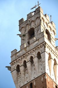 La Torre del Mangia domina il cielo senese con i suoi 88 metri. Ha la stessa altezza del campanile del Duomo e non è certo un caso ma piuttosto l’equivalenza simbolica fra potere politico e potere temporale.